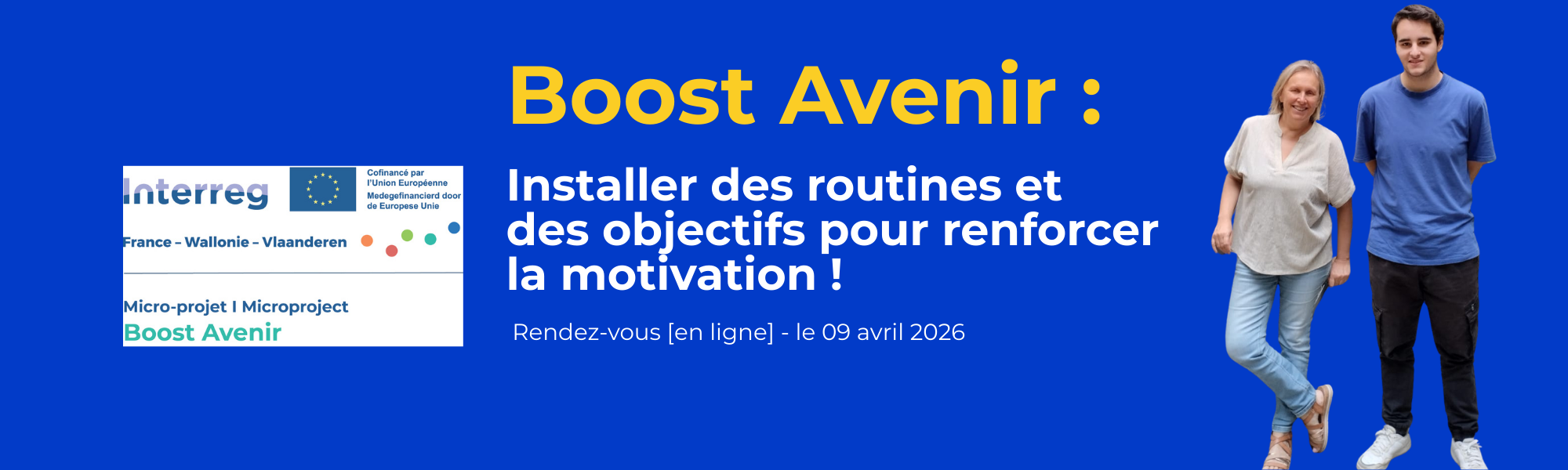 Le projet BOOST AVENIR a pour mission de favoriser l’insertion socioprofessionnelle des jeunes âgé·e·s de 15 à 25 ans à travers le mentorat, en développant des outils innovants. Il est financé par le programme de coopération territoriale européenne INTERREG France-Wallonie-Vlaanderen (FWVL) de l’Union européenne.