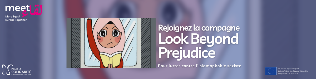 POUR LA SOLIDARITÉ-PLS, convaincu de la nécessité d’agir pour prévenir l’islamophobie envers les filles et femmes, mène avec ses partenaires le projet MEET – More Equal Europe Together. C’est dans ce cadre qu’est lancée la campagne « Look beyond prejudice », dont le premier épisode a été illustré par la dessinatrice Takoua Ben Mohamed.